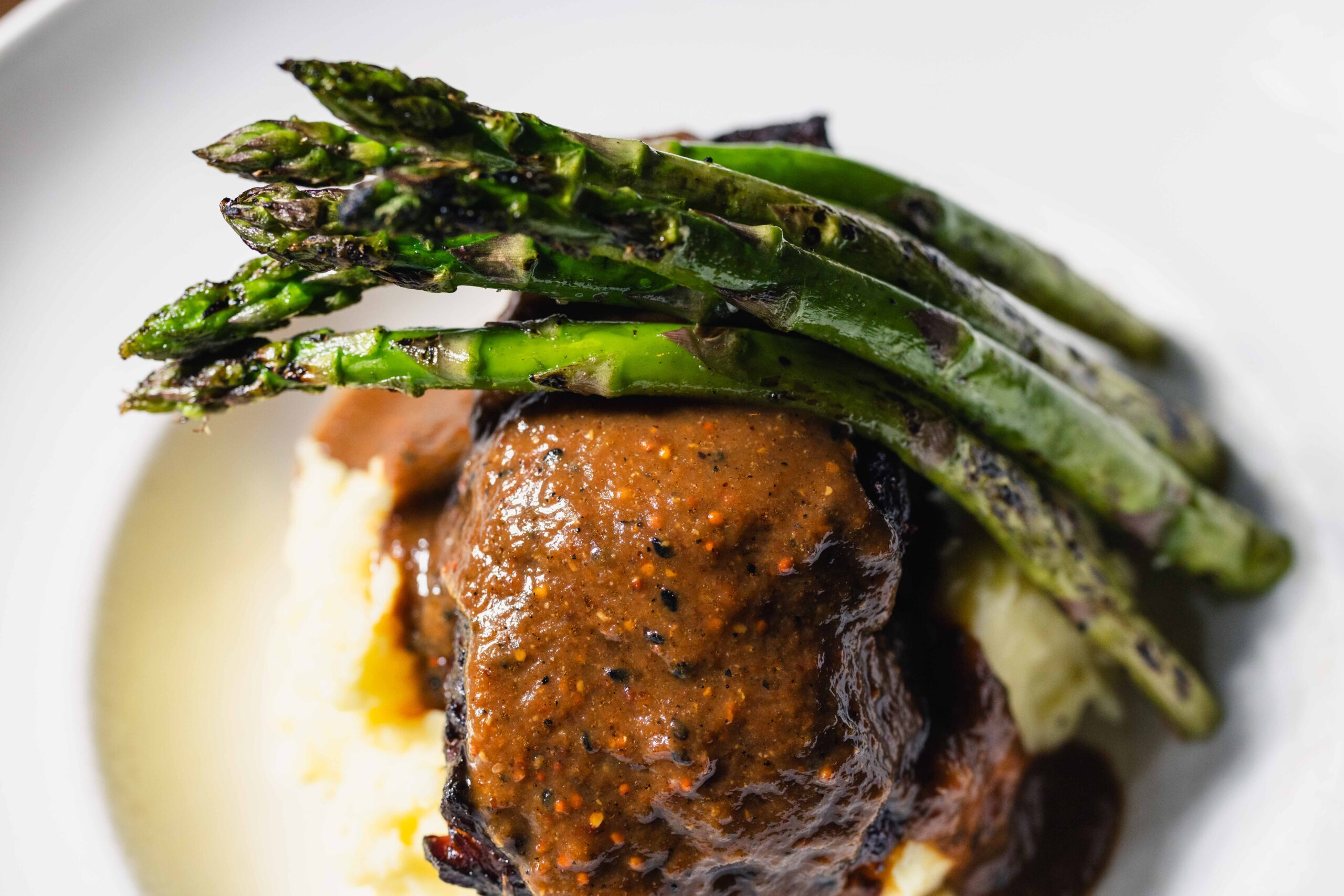 mashed potatos, asparagus, and a fig-grain mustard demi glace 34