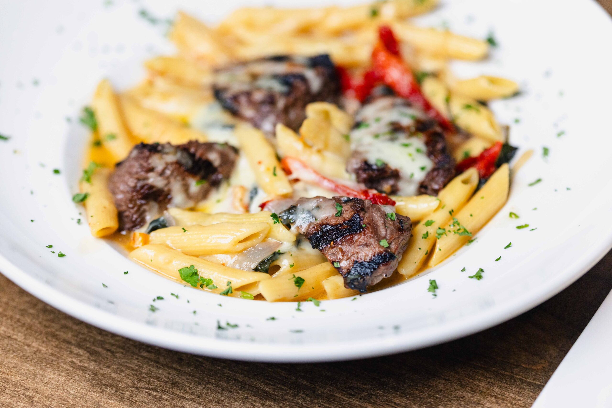 Steak tips, shallows, sun-dried tomatoes, and spinach tossed in a garlic butter-wine sauce, served over penne pasta and topped with melted cheddar cheese 30